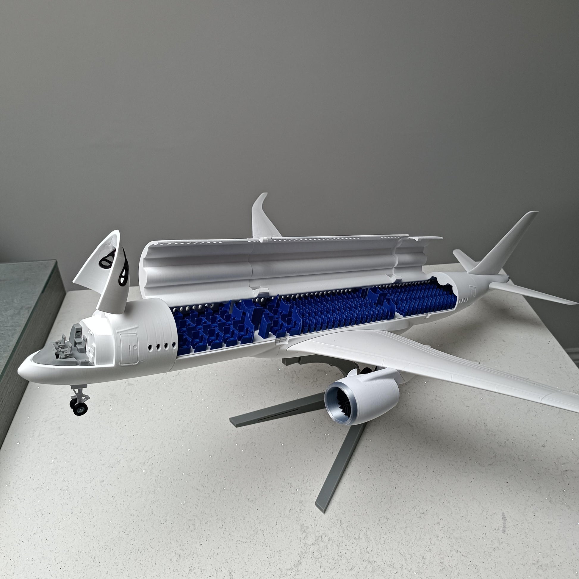 Openable fuselage with visible cabin seating